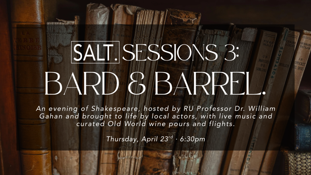 On Thursday, April 23 at 6:30pm, we’ll be hosting a Shakespeare night led by RU Professor Dr. William Gahan, featuring Shakespearean sonnets performed by local actors and students, along with live music throughout the evening.